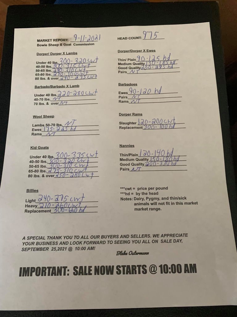 Above is a photo of a sales market report for a sheep and goat auction in September 2021. Every auction has to post a market report of how each sale performs shortly after the sale. I track the price trends for the size of lambs I sale at the auction to know the best possible time to sell my lambs. This is not exact, but a common practice with people producing, buying and selling sheep. There are holidays during the year where the prices will jump up and after the holidays, the prices will drop.