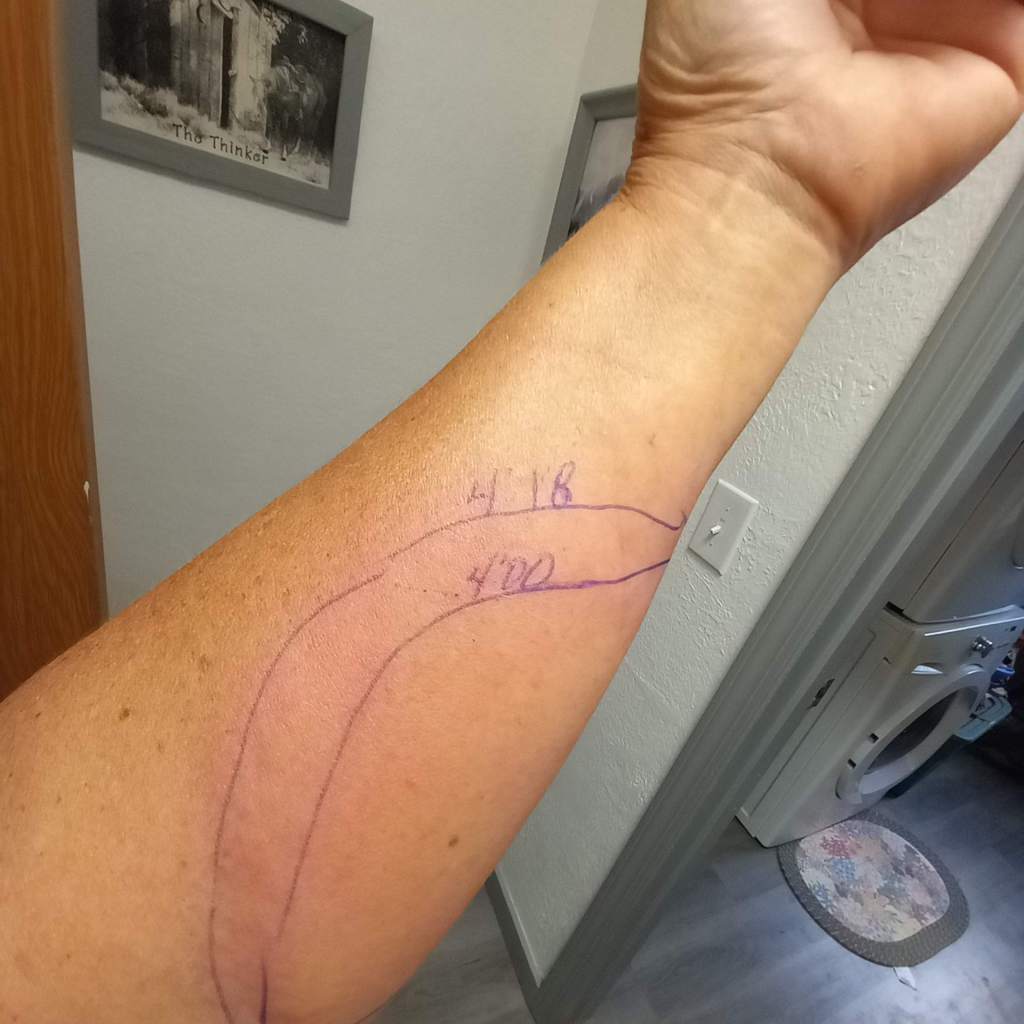 The Medical Assistant who took us to the exam room, took my vitals and information was very professional, through and attentive. She asked me were I had learned to draw a line on the swelling and time, called mapping. I informed her I had trained for the Mounted Search and Rescue as part of the Montezuma Sheriff’s Posse in Colorado when I was much younger. While looking at my arm, she stated “It is very angry.” A very appropriate description.