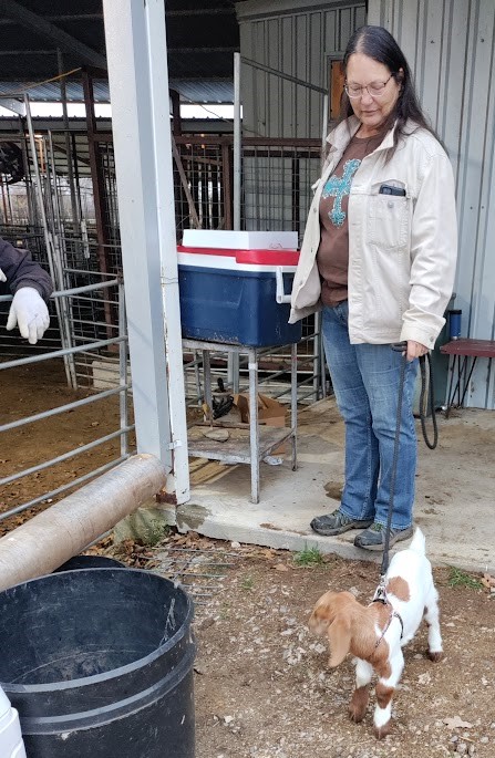 Today, I brought my new “dog” Spot to the auction. I brought Spot into the auction sitting area on a leash. Spot has learned to be led by a leash and dog harness. Eyes are drawn to a person with a baby goat on a leash. It gave me the opportunity to meet a few new people, possible sheep buyers of my breeding stock. Children get bored at the auction, they have a hard time listening to the auctioneer. A baby goat on a leash, the children come with parents near to ask if they can pet my goat. Several children sat quietly next to me and my goat, giving my baby goat plenty of attention. Spot loves to sit on my lap and be petted. Currently, Spot thinks he belongs on my lap, something that is going to have to change soon.