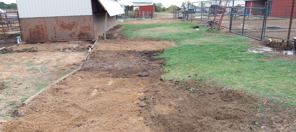 Using manure from the shelters and wood frames from my old raised garden I was able to create the terraces. The manure formed a plant nutritious layer, covered with soil for future growth of grasses. The wood boards formed a solid structure to hold the soil and manure in place until the grasses could grow covering the area. The wood boards will decompose, as they are already starting to decay.